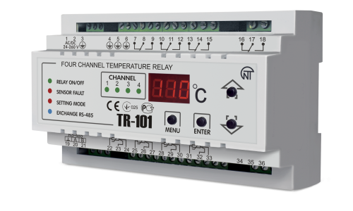 Cyfrowy przekaźnik kontroli temperatury TP-101 służy do pomiaru i kontroli temperatury z czterech niezależnych czujników podłączonych w konfiguracji 2- lub 3-przewodowej oraz wyświetlania odczytów na wyświetlaczu.
