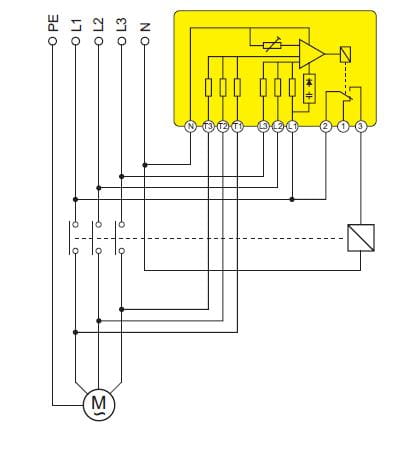Chroni silniki trójfazowe przed uszkodzeniem spowodowanym pracą przy niepełnym zasilaniu. Urządzenie wyłącza obwód zasilania cewki stycznika sterującego silnikiem w przypadku wystąpienia asymetrii napięć w poszczególnych fazach, a w szczególności zaniku napięcia w co najmniej jednej z faz. Kontroluje napięcie także za stycznikiem