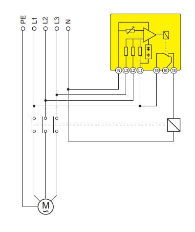 Chroni silniki trójfazowe przed uszkodzeniem spowodowanym pracą przy niepełnym zasilaniu. Urządzenie wyłącza obwód zasilania cewki stycznika sterującego silnikiem w przypadku wystąpienia asymetrii napięć w poszczególnych fazach, a w szczególności zaniku napięcia w co najmniej jednej z faz, a także w przypadku nieprawidłowej kolejności faz. Nie chroni przed symetrycznym spadkiem napięcia.