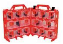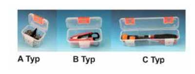pudełko z twardego tworzywa z małymi pojemnikami bez zawartości do ułożenia praski, końcówek, opasek kablowych oraz innych drobnych elementów