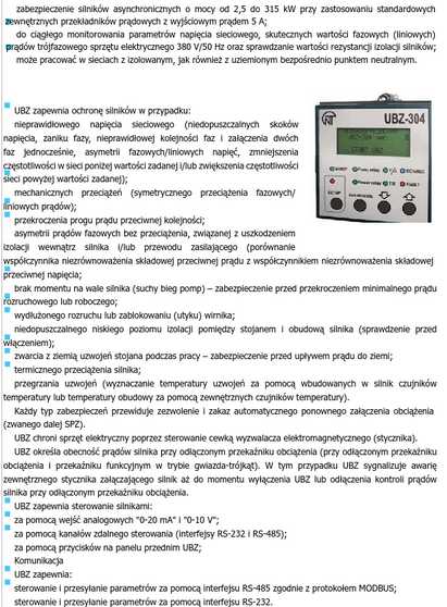 UBZ zapewnia ochronę silników w przypadku: nieprawidłowego napięcia sieciowego (niedopuszczalnych skoków napięcia, zaniku fazy, nieprawidłowej kolejności faz i załączenia dwóch faz jednocześnie, asymetrii fazowych/liniowych napięć, zmniejszenia częstotliwości w sieci poniżej wartości zadanej i/lub zwiększenia częstotliwości sieci powyżej wartości zadanej); mechanicznych przeciążeń (symetrycznego przeciążenia fazowych/ liniowych prądów); przekroczenia progu prądu przeciwnej kolejności; asymetrii prądów fazowych bez przeciążenia, związanej z uszkodzeniem izolacji wewnątrz silnika i/lub przewodu zasilającego (porównanie współczynnika niezrównoważenia składowej przeciwnej prądu z współczynnikiem niezrównoważenia składowej przeciwnej napięcia; brak momentu na wale silnika (suchy bieg pomp) ? zabezpieczenie przed przekroczeniem minimalnego prądu rozruchowego lub roboczego; wydłużonego rozruchu lub zablokowaniu (utyku) wirnika; niedopuszczalnego niskiego poziomu izolacji pomiędzy stojanem i obudową silnika (sprawdzenie przed włączeniem); zwarcia z ziemią uzwojeń stojana podczas pracy ? zabezpieczenie przed upływem prądu do ziemi; termicznego przeciążenia silnika; przegrzania uzwojeń (wyznaczanie temperatury uzwojeń za pomocą wbudowanych w silnik czujników temperatury lub temperatury obudowy za pomocą zewnętrznych czujników temperatury).